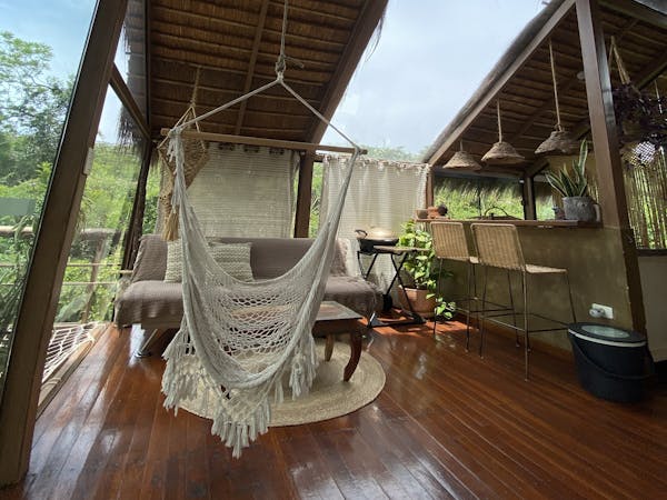 Además, Lyra ofrece un balcón, cama de redes en el exterior de la habitación, que nos permite contemplar la naturaleza, suspendidos en el aire, en todo momento.